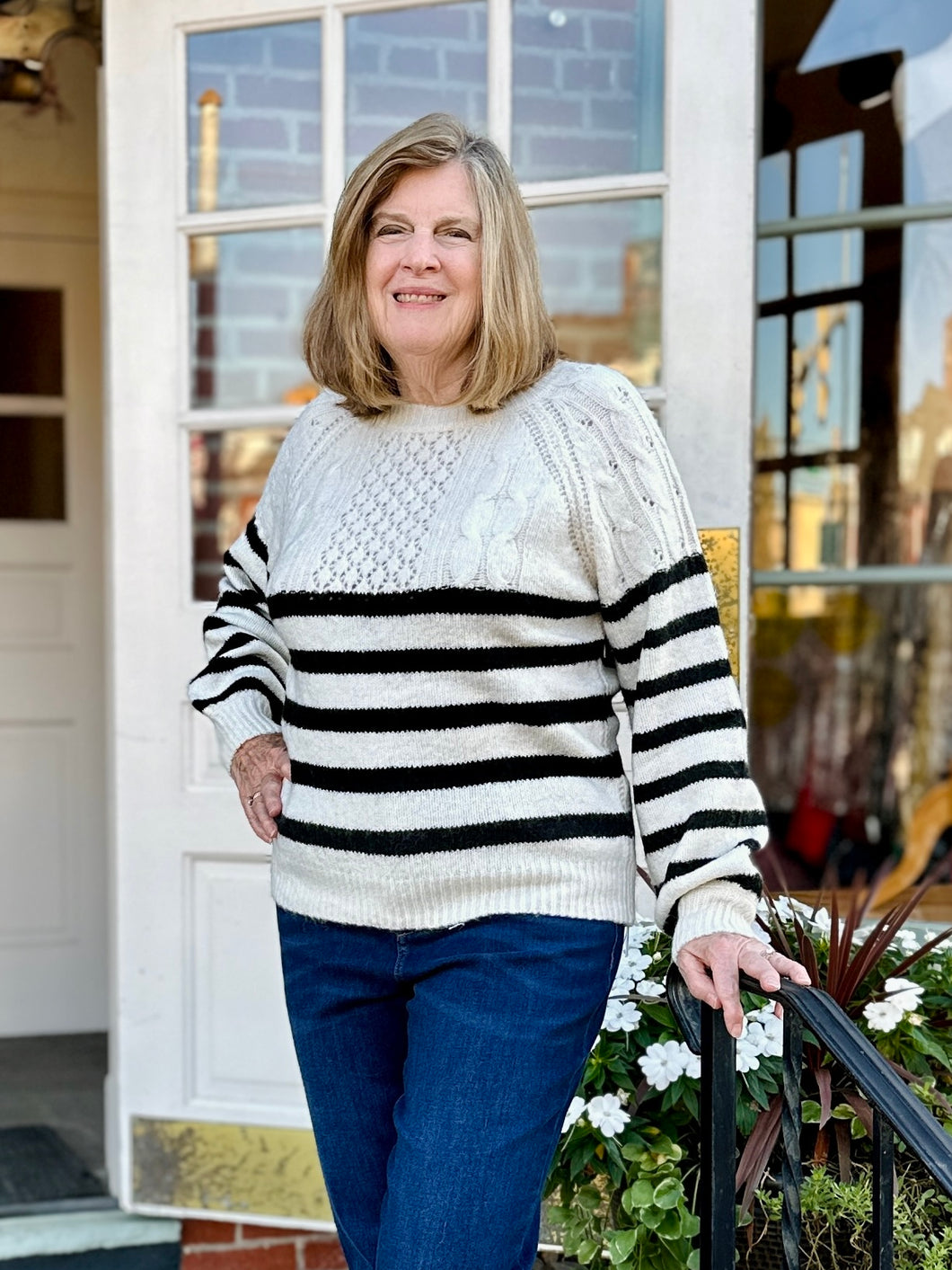The Molly Bracken Timeless Stripe Sweater offers a straight fit with a wide round neckline and ribbed edges. Its unique braided and openwork knit across the bust adds subtle detail, making it a versatile and comfortable choice for everyday wear.