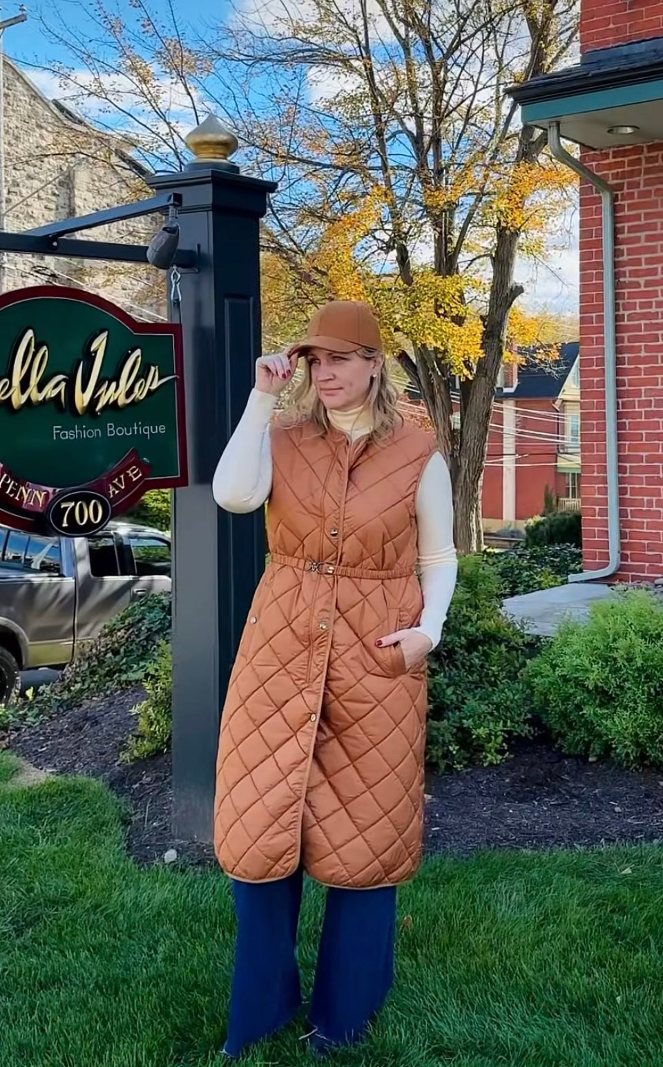 The Bronze Nylon Quilted Long Vest is a modern layering essential that combines warmth and effortless style. Designed with diamond quilting and a sleek open-front zipper with snap buttons, this lightweight vest delivers a polished finish to any fall look. Pair it with a fitted sweater or turtleneck for a chic, cozy outfit that transitions seamlessly through the season.