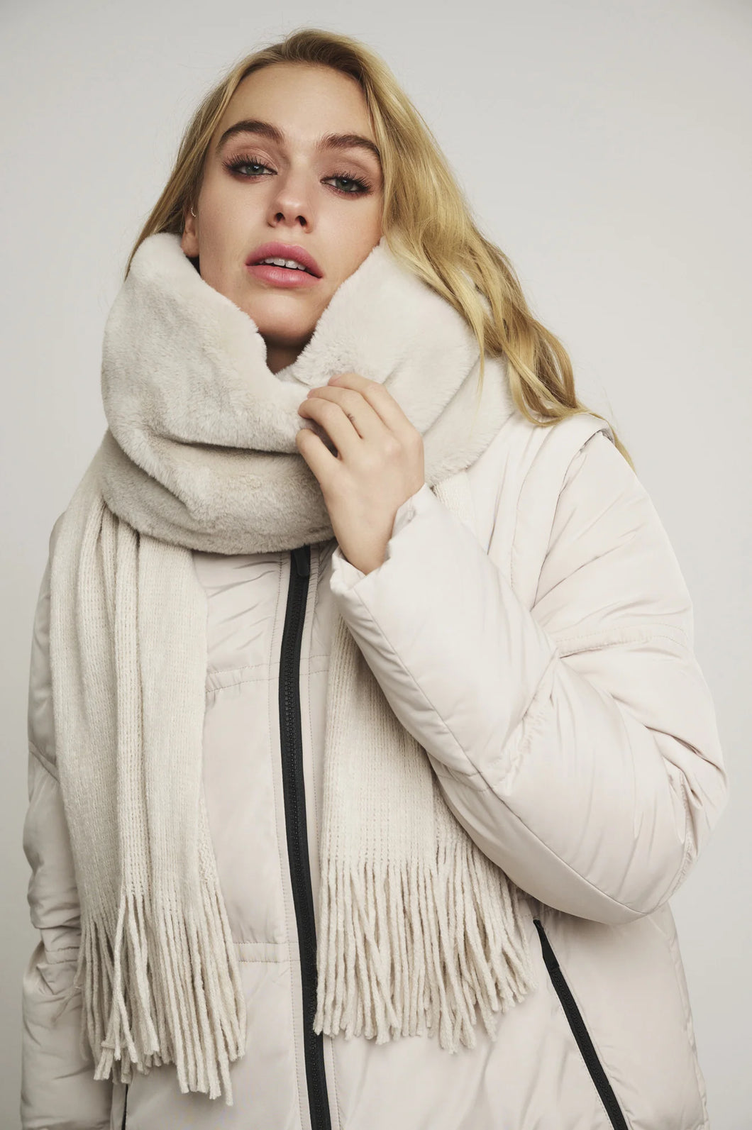 Wrap yourself in softness and style with our faux fur scarf. This tonal woven scarf boasts faux-fur details and wide fringed ends for a playful touch. Perfect for staying cozy and chic!