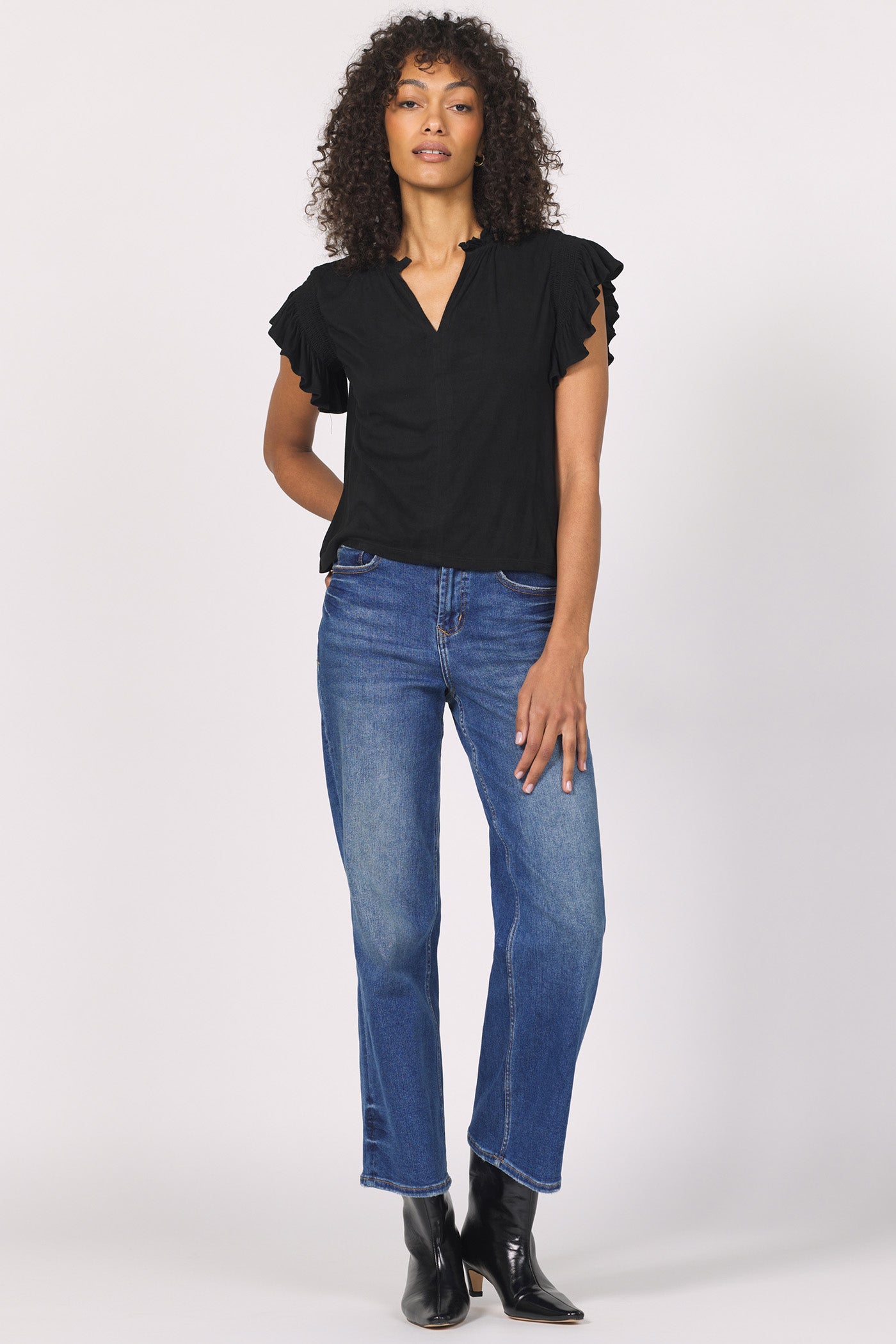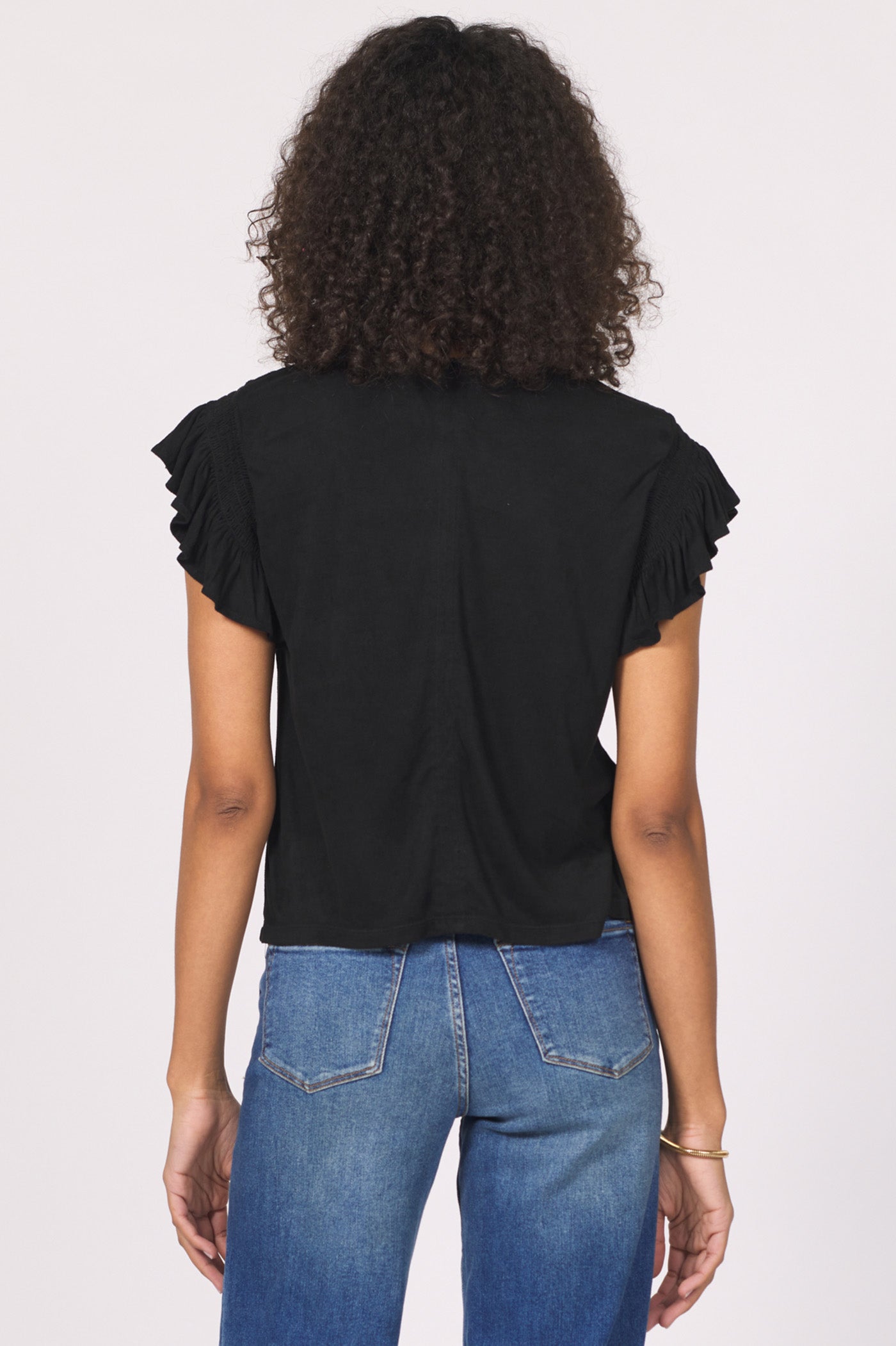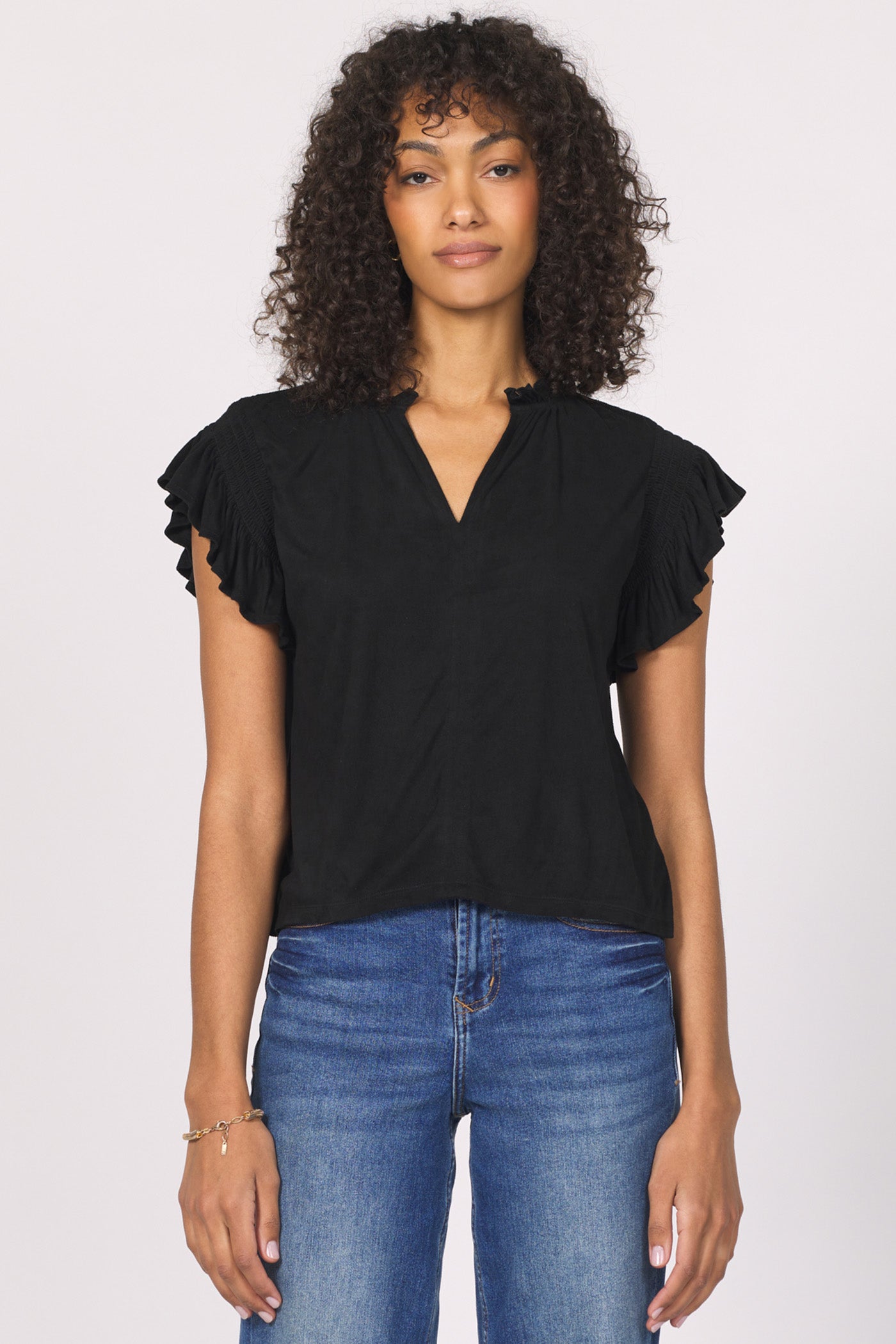 Feminine and effortlessly polished, the Nicola Faux Suede Top in black adds modern sophistication to any wardrobe. Crafted from soft faux suede with a hint of stretch, this top features a romantic ruffled neckline and delicate smocking at the sleeves for subtle texture and shape. Its flattering silhouette transitions beautifully from work to evening—perfect for pairing with denim, skirts, or tailored trousers.